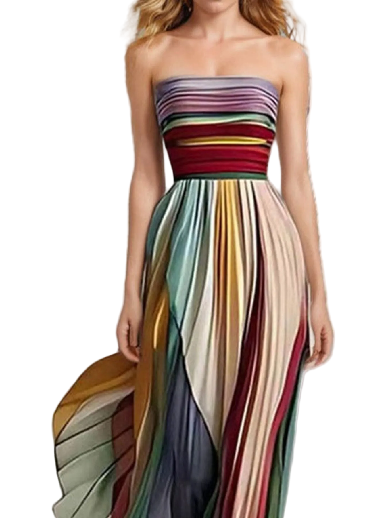 Striped Pleated Strapless Maxi Dress-JSandiClothing