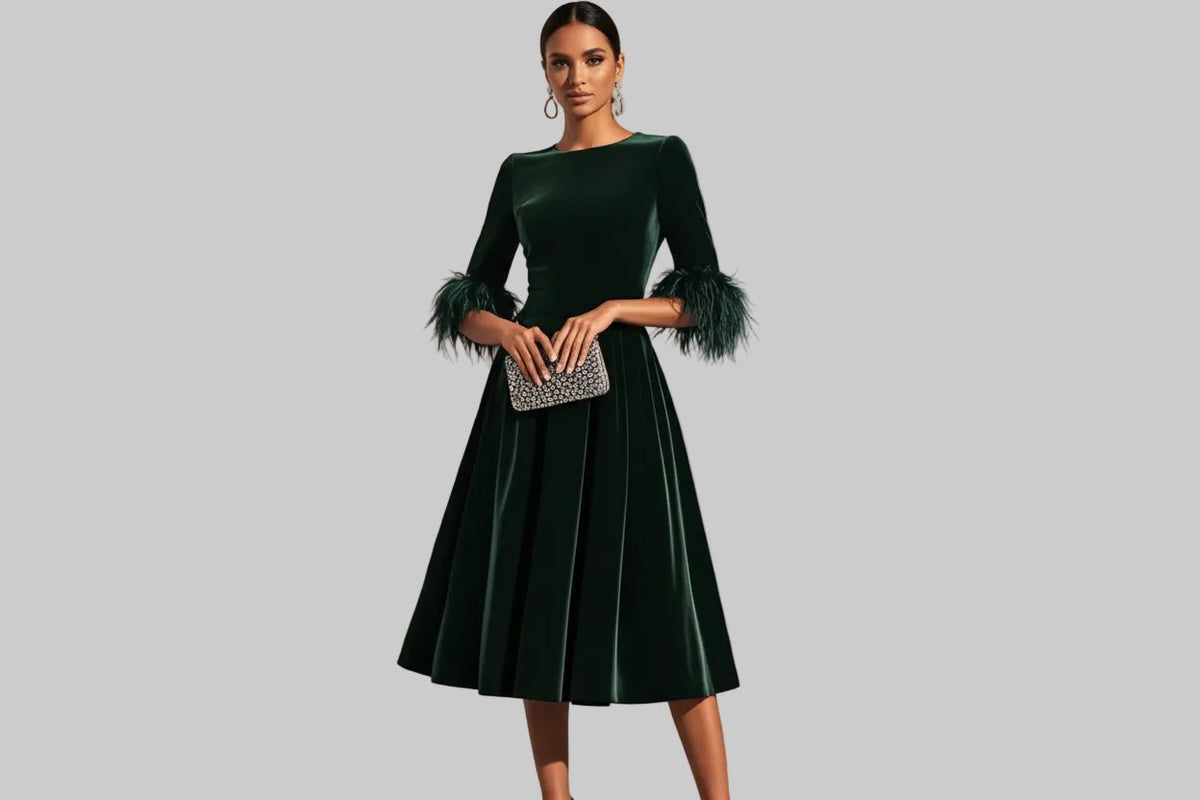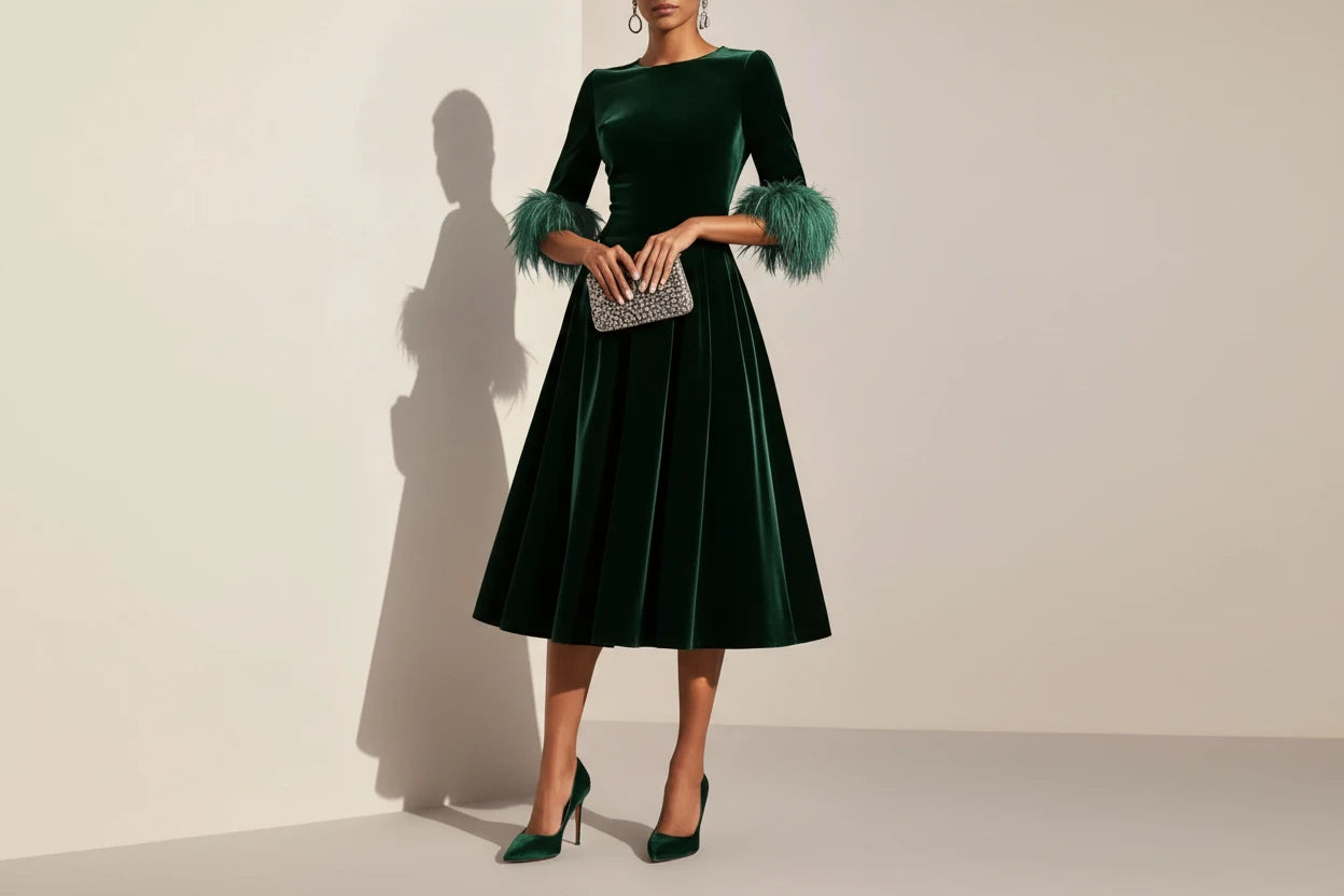 The plush velvet fabric drapes beautifully along your silhouette, offering a flattering midi length that's perfect for formal events, cocktail parties, and special celebrations. Dramatic feather-trimmed cuffs add an unexpected touch of whimsy and luxury, elevating this dress from elegant to extraordinary.