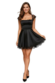 Lace Trim Square Neck Mini Dress - Black / XS