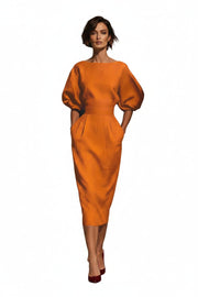 Introduce a touch of whimsy to your wardrobe with our Round Neck Puff Sleeves Midi Dress — a beautifully balanced silhouette that pairs playful drama with refined sophistication. The classic round neckline keeps the look clean and timeless, while statement puff sleeves add a fashion-forward flourish that elevates any occasion.