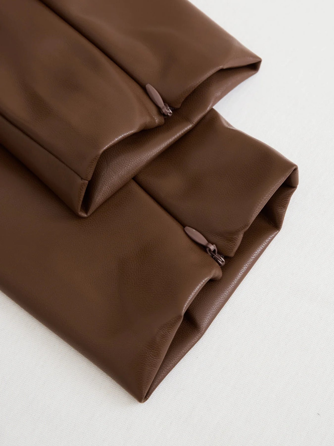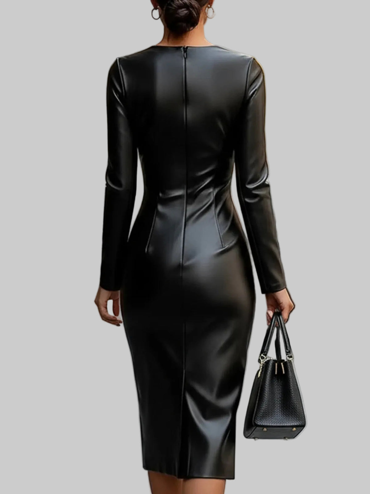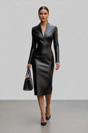 Confidence looks good on everybody. This full size leather V-neck midi dress is designed to celebrate curves with a sleek, structured silhouette that commands attention in every room.