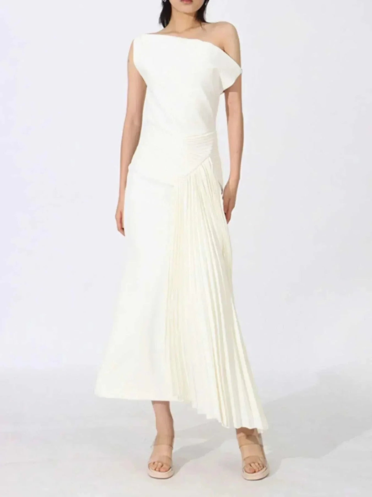 Make a stunning statement with our Single Shoulder Pleated Dress, a sophisticated piece that effortlessly combines elegance with modern design. This eye-catching dress features a unique asymmetrical single shoulder silhouette that beautifully frames your neckline and shoulders, creating a flattering and feminine look.