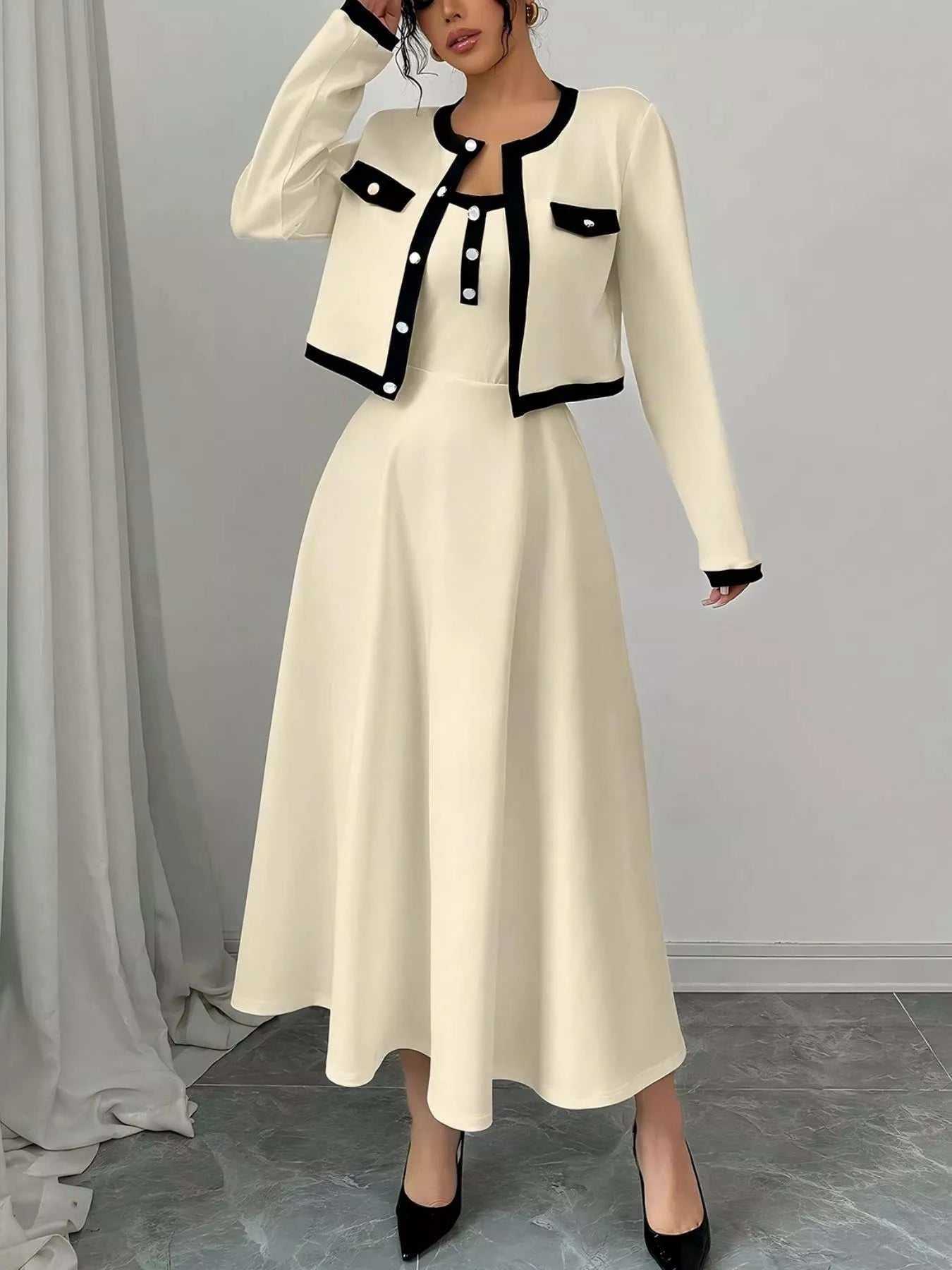 Shop the elegant Contrast Trim Maxi Dress & Cropped Cardigan Set. Perfect for any occasion, this stylish two-piece outfit combines comfort and sophistication.